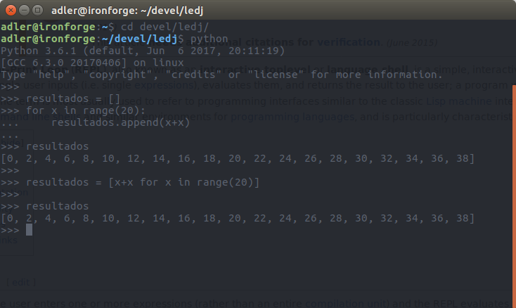 O exemplo de list comprehensions eu fiz usando o shell interativo e hoje em dia, eu uso ele até quando preciso fazer alguma conta, dispensando o uso de uma calculadora. Me disseram que isso é coisa de quem está virando um pythonista.